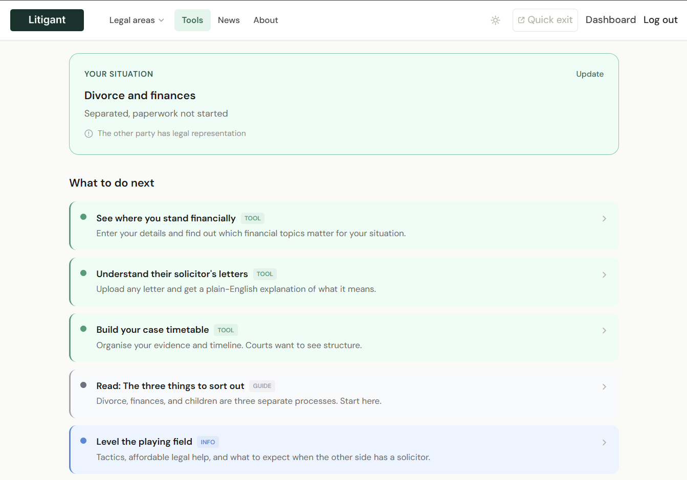 Litigant provides legal information, not legal advice. We engaged the SRA Innovate team early to confirm boundaries. The product is designed so that no feature crosses into reserved legal activities.