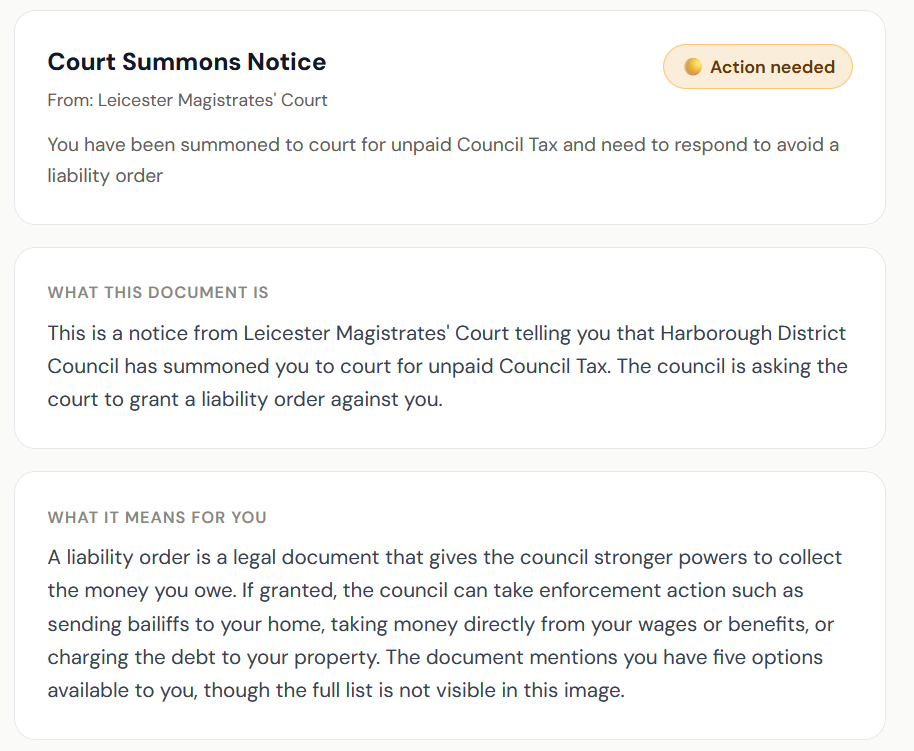 Live output: a Magistrates’ Court summons explained in plain English.