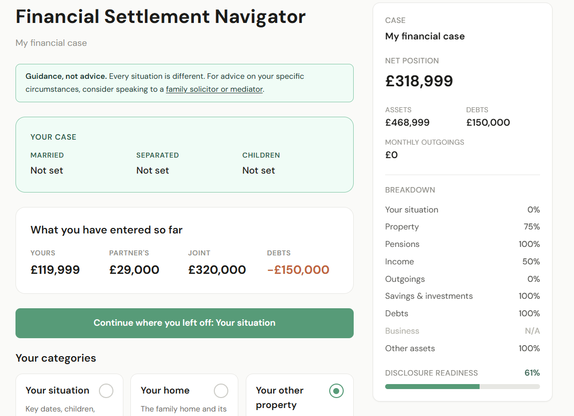 Financial Settlement Navigator. The full divorce process, organised.