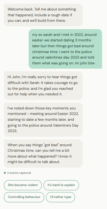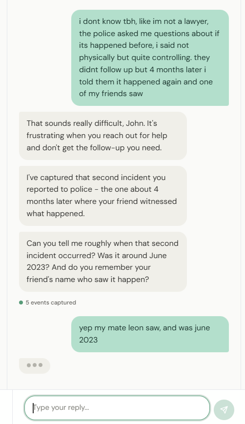 5 events captured in 4 messages. No forms. No legal jargon. No solicitor.