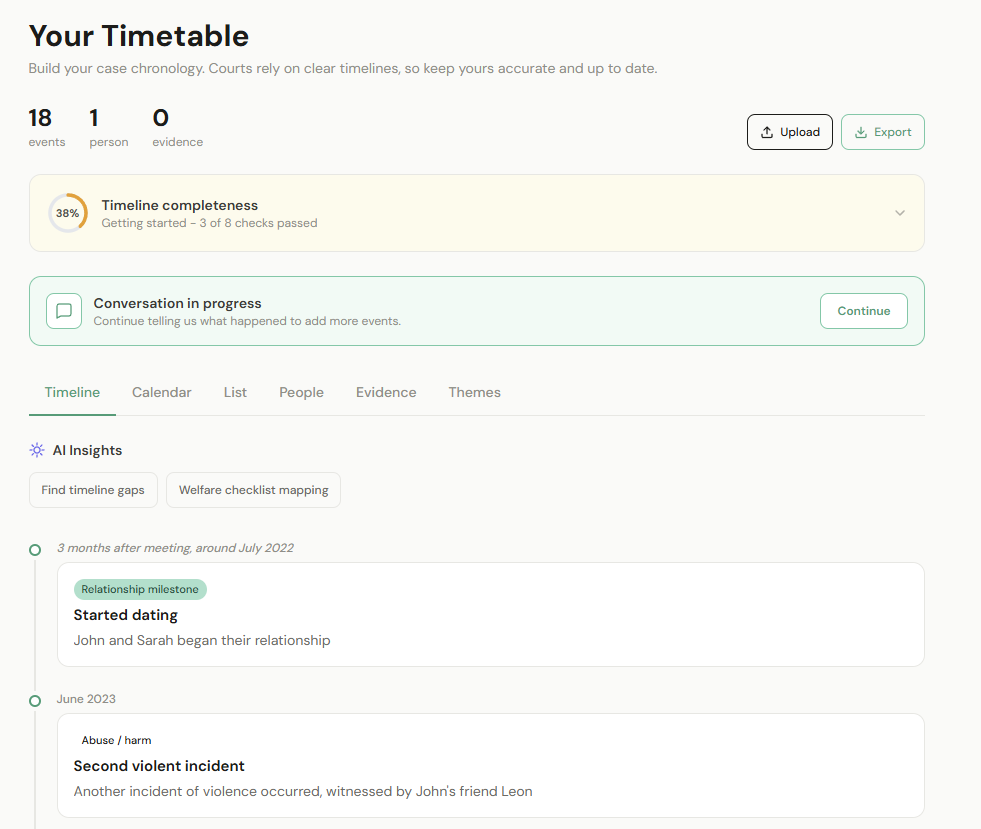 Timeline, evidence organiser, Form E support