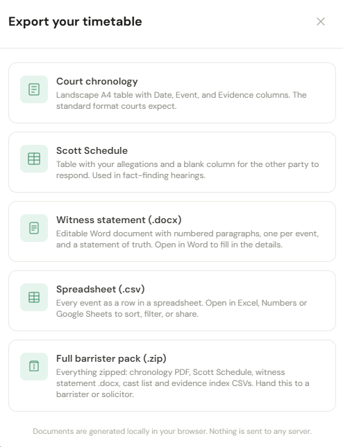 Triage. Decode. Build a chronology. Practise cross-exam. Prepare disclosure. Get hearing-ready.